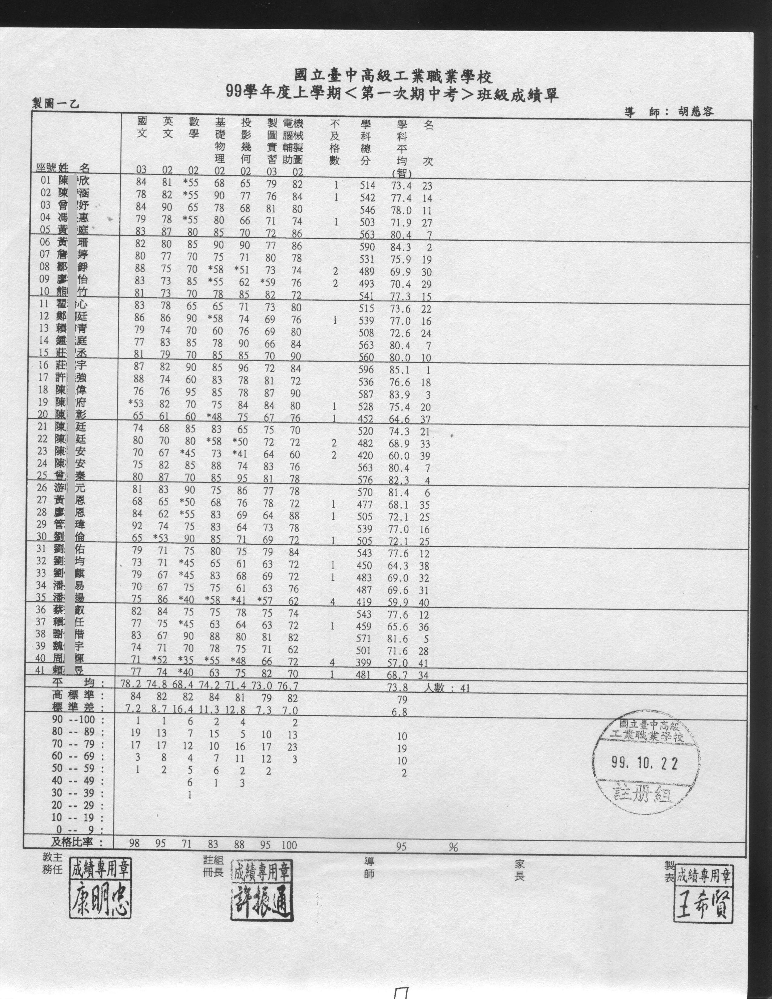 99上 第一次期中考 成績單